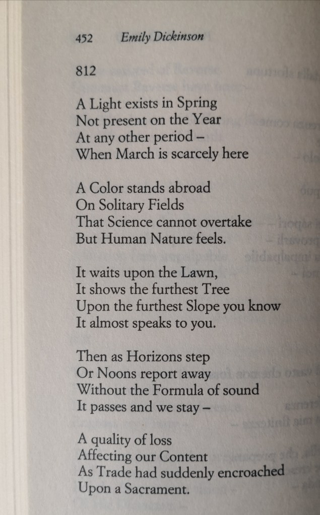 “Una luce c’è in primavera/ non presente nel resto dell’anno/ in qualsiasi altra stagione -/ Quando marzo è appena arrivato// un colore appare fuori/ sui campi solitari/ che la scienza non può sorpassare/ ma la natura umana sente.// Indugia sopra il prato,/ delinea l’albero più lontano/ sul più lontano pendio che tu sappia/ quasi sembra parlarti.// Poi come orizzonti arretrano/ o il mezzogiorno trascorre,/ senza formula di suono/ esso passa e noi restiamo -/ e una qualità di perdita/ tocca il nostro sentimento/ come se a un tratto il guadagno/ profanasse un sacramento.//”
