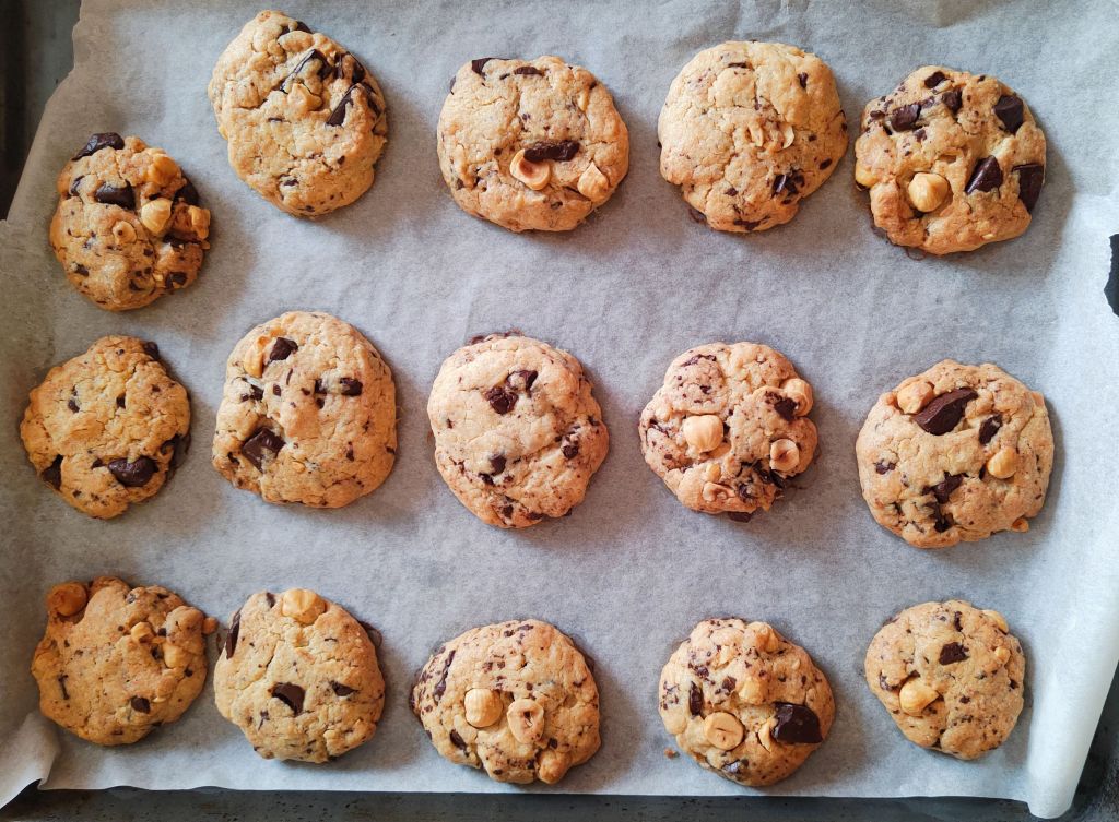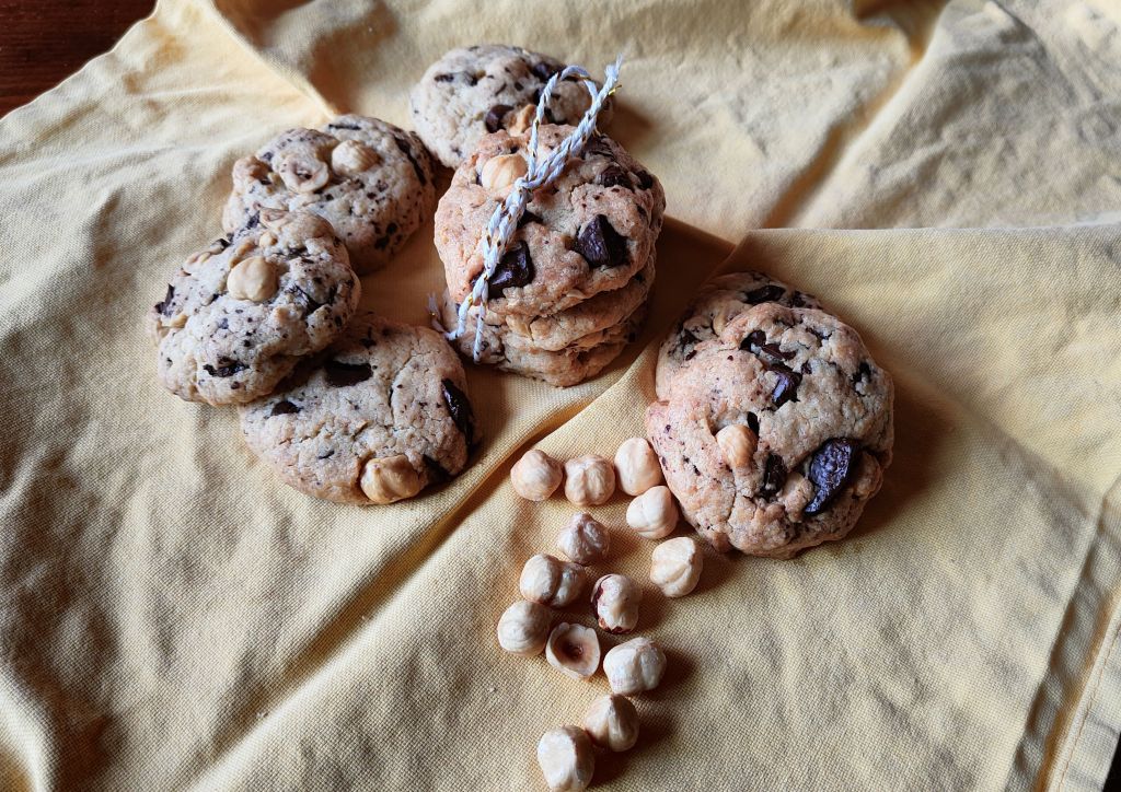 Procedete dunque a sminuzzare le nocciole e il cioccolato con un coltello. Io vi consiglio di sminuzzare entrambi in pezzi abbastanza grossi, di modo che si sentano bene già al primo morso. In alternativa, per un biscotto più omogeneo, triturate nocciole e cioccolato più finemente con l’aiuto di un mixer.