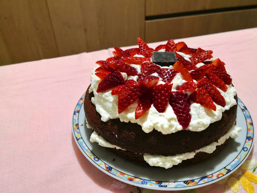 Ovviamente, il gusto panna + fragole deve piacere al palato (a me personalmente fa impazzire): sono consapevole che per qualcuno può risultare un po’ stucchevole. C’è da dire che la base al cioccolato, non essendo di pan di spagna, contribuisce ad evitare l’effetto “spugna assorbente” di alcuni dolci di pasticceria decisamente poco invitanti. Questa torta mantiene infatti una base più compatta e gustosa, senza essere comunque troppo pesante.