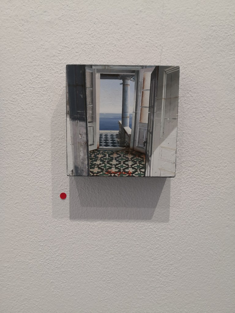 Fra le opere che mi hanno colpita di più ci sono le tele di Matteo Massagrande che, seguendo il filone della pittura figurativa, riproduce interni architettonici finemente piastrellati affacciati su scorci di mare o immersi in boschi misteriosi: mi trasmettono un senso di nostalgico abbandono e di malinconico attaccamento al passato.