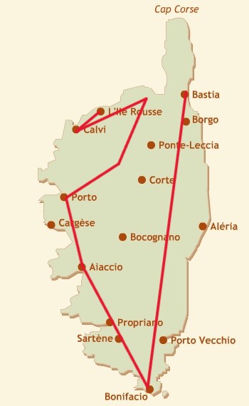 Ecco il giro che abbiamo fatto, alloggiando in tutto in quattro diversi campeggi (le prime due notti a Calvi, la terza a Porto, la quarta ad Ajaccio, la quinta e la sesta a Bonifacio):