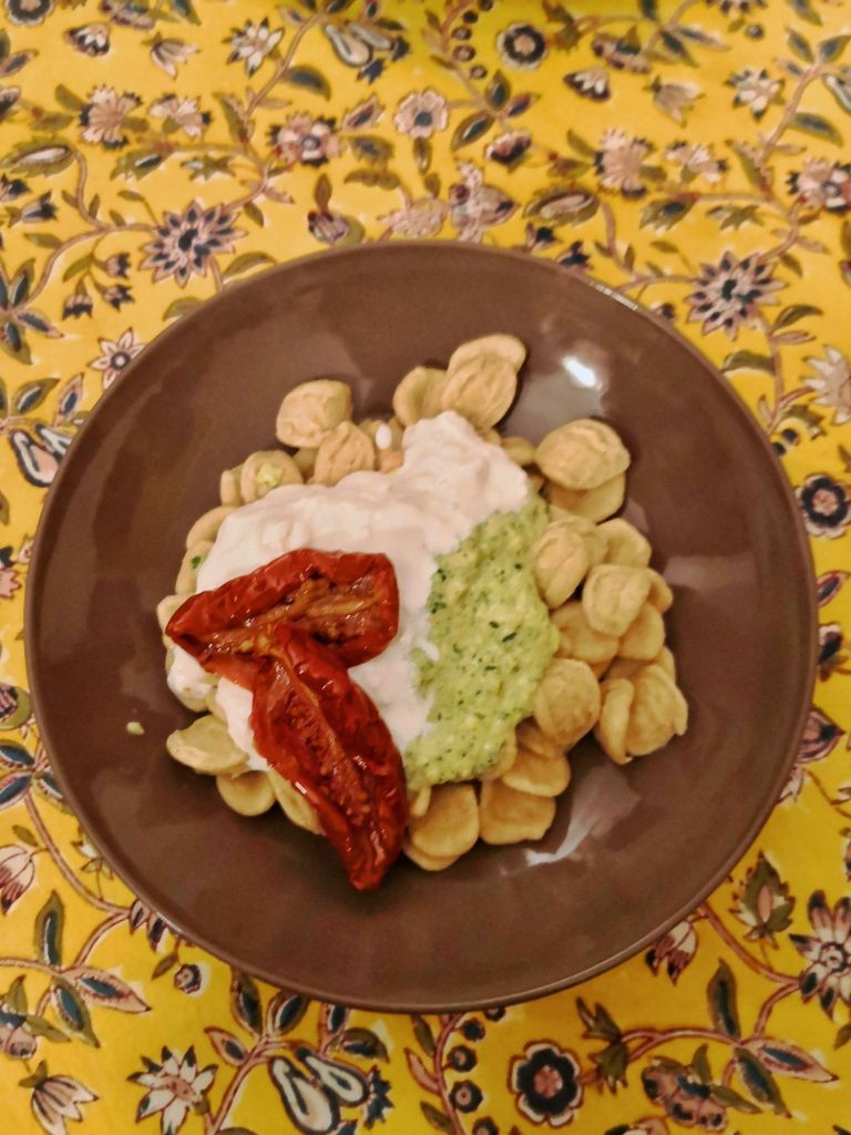 Nel frattempo, messa a bollire l’acqua, si possono far cuocere le orecchiette, che sono pronte in pochissimo tempo. A questo punto, basta semplicemente comporre il piatto: io ho fatto scaldare un po’ in microonde il pesto, e poi l’ho distribuito sui piatti, aggiungendo sopra un cucchiaio di stracciatella e i pomodori secchi in olio.